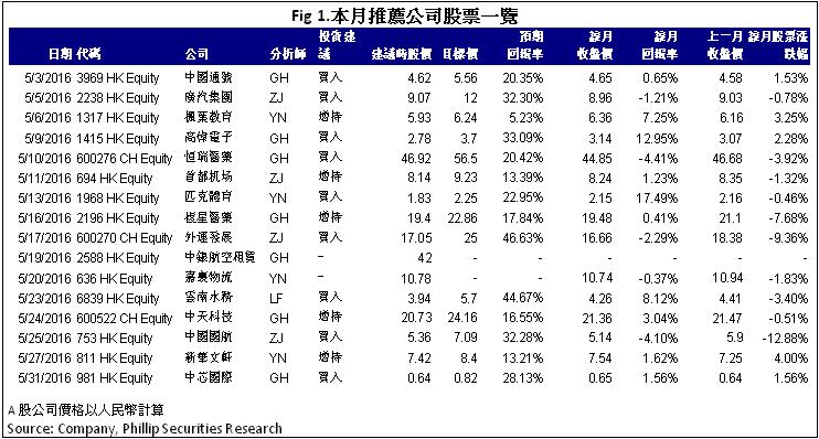 5月我发布了七家上市公司的研究报告,分别是中国通号(3969 HK)、高伟电子(1415 HK)、恒瑞医药(600276 CH)、复星医药(2196 HK)、中银航空租赁(2588 HK)、中天科技(600522 CH)和中芯国际(0981 HK)。中国通号是全球最大的轨道控制系统解决方案提供商,技术全球领先,在铁路信号领域具有垄断优势,在其他轨道交通信号领域亦为领导者。2015年,公司录得营收239.5亿人民币,按年增长38.2%,纯利25亿元,增长22.8%。凭藉领先的技术、寡头垄断地位、充足的资金及更低的负债,中国通号不仅在铁路领域维持稳健成长,还将在PPP等新兴领域快速拓展,城市轨道交通领域还将维持爆发式成长。同时,公司继续依赖降本增效、集中采购及精细化管理,毛利率将维持在25%左右的水准,因此,公司快速增长前景仍可期。我们给予其对应2016年EPS 13.5倍估值,目标价5.56港元,首予“买入”评级。