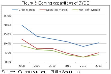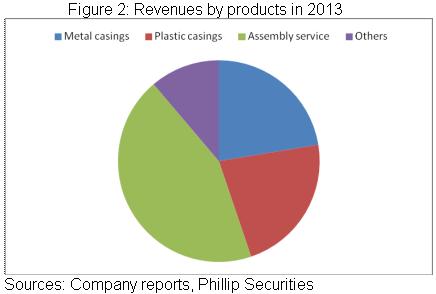 根据2013 年财报,公司当期实现营收160.6 亿元人民币(下同),同比增长14%,实现毛利16.8 亿元,同比增长41%,归属母公司净利润更大增71%至6.48 亿元。总体来看,13年公司业务扩张主要是得益於手机部件及模组业务收入大增44%至91亿元,占比总收入56%。同时,公司盈利能力亦继续提升,毛利率和净利率分别达致10.5%及4%,同比提升2.0及1.3个百分点,这主要仍是受益于高毛利率的金属外壳(采用塑胶与金属混融技术)出货量快速增长,该业务毛率一般达致20%,其他塑胶壳业务仅为10%左右,组装服务毛率更低至5%以下。