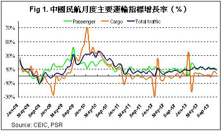 2013年前11月,中国民航全行业总运输周转量,旅客周转量和货邮周转量分别同比增长10.3%,12.7%和3%,增速较上年同期(5.8%,10.2%,-7.3%)有所提升。