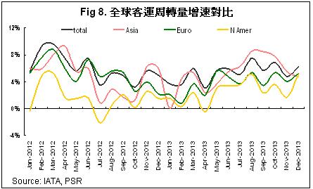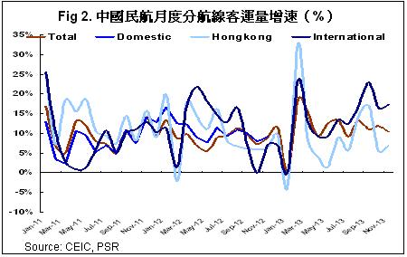 总体来看,我们预计2014年内地航空业需求增速将在12%左右。2013年公商务客受经济影响明显减弱,从2014年来看,商务需求在宏观经济“调结构,稳增长”及限制公款消费政策延续的压力下,出现强复苏的概率不大。而旅游探亲航空需求则有望在人民币升值,签证审批放宽的趋势中保持较高增长。航空客源的结构调整将持续考验航空公司的渠道改革,运力分配及战略规划。