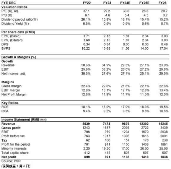 预计公司2024/2025/2026年的每股盈利分别为1.87/2.34/3.03元人民币,目标价67.7元,对应2024/2025/2026年36.2/29/22.4倍预计市盈率,给予增持评级。(现价截至3月6日)
