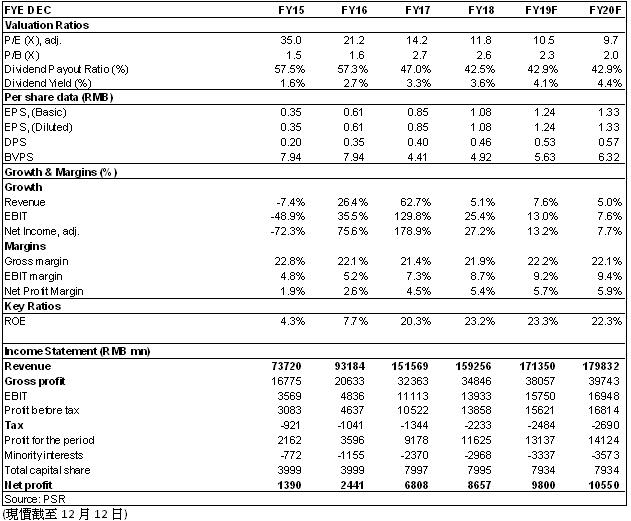 我們上調2019/2020年的盈利預測至每股收益將達到至1.24/1.33元。我們給予目標價16.3港元,對應2019/2020年11.7/10.9倍市盈率,較現價有12%的上升空間,增持評級。風險是商用車景氣度低于預期,新業務推進低于預期。(現價截至12月12日)