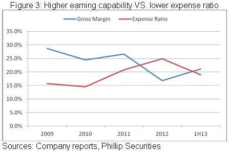 受制于市場競爭劇烈、清理庫存等因素,12年公司毛利率快速下跌近10個百分點至16.8%,但是,我們認為其未來的盈利能力有望提升。首先,4G訂單等帶動公司產能大幅放量的背景下,規模效應將較為突出。其次,4G產品占比提升,不僅預示著更高的售價,也將貢獻更高的盈利,譬如,TDL 天線平均售價即可能較TDS天線高出30%。另外,在前兩年費用占比分別大幅增加逾6個及4個百分點並于2012年達致25%的高位下,未來費用占比亦有望下降,上半年即已重新回至20%以內。