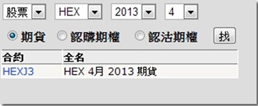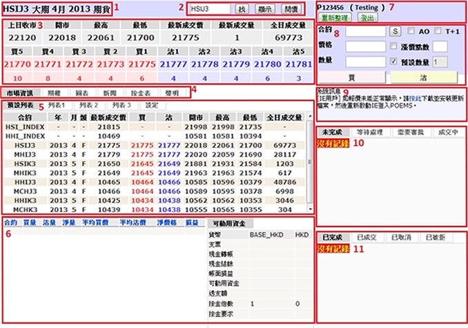 1) 合約名稱,顯示合約詳情(如月份、行使價等)。 2) 客戶可於空格輸入合約代號,然後按顯示。按「找」會彈出視窗,客人可選擇欲查詢的合約。而「問價」則是莊家問價。 3) 顯示合約最新價格資訊,包括高低位及5口價格深度。 4) 客人可選擇不同的功能,例如轉換指數期權買賣、查看圖表、即市新聞、查詢按金等。 5) 預設列表會顯示即月及下月的大細期指、國企及現貨價,只需按一下所須合約,上方便會即時顯示合約詳細資訊。客人亦可按「設定」自設心水列表,我們提供3個列表,最多30個合約組合。 6) 顯示倉底及資金情況。 7) 顯示帳戶名稱、號碼。「重新整理」是更新交易狀態資訊。 8) 買賣落盤平台,「AO」代表競價盤,「T+1」則代表期貨夜市盤。 9) 系統信息會顯示交易狀態最新資訊,例如排盤中的合約成交了,會於系統信息中顯示。 10) 未完成的落盤指示會於「未完成」中顯示。如因資金不足,會顯示於「等待處理」或「需要審批」中。 11) 顯示所有已成交或已取消的指示。 如何選擇股票期貨買賣? 客戶如果想買賣股票期貨,首先可按上圖第2點裡的「找」打開合約搜尋視窗,於最左邊的下拉視窗選擇「股票」,然後選擇股票合約 (如HEX = 港交所) ,之後再選擇時期,再按「找」,最後按合約代號便成。 最後,Java版本的期貨買賣平台將於2013年6月30日暫停服務。現在於「香港期貨及期權」下的「串流版」將不會再顯示。取而代之為Ajax版本的「期貨買賣」。而當進入「期貨買賣」時不能正當顯示報價,可能是由於瀏覽器設定不正確所致,客人可參考這裡解決有關問題。 如對以上內容有任何問題,可致電2277-6661或電郵致ats@phillip.com.hk查詢。