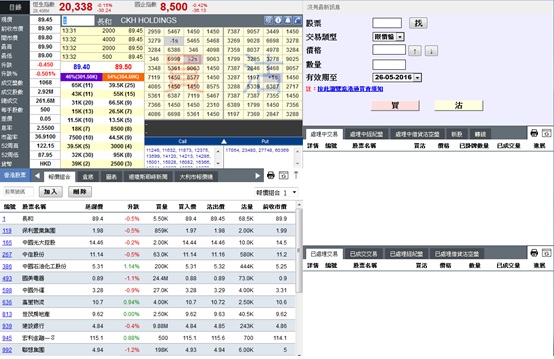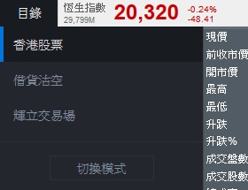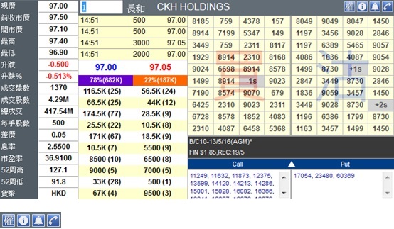 此報價版面支援香港股票及滬股通股票報價。在右下角增設表格提示相關牛熊證。