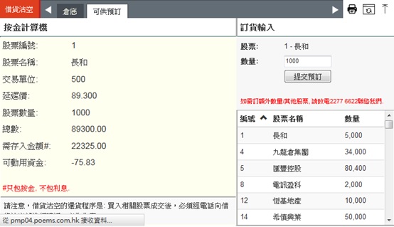 在右上方的「訂貨輸入」下面輸入閣下想沽空的股票編號及數量,並按下「提交預訂」鍵。