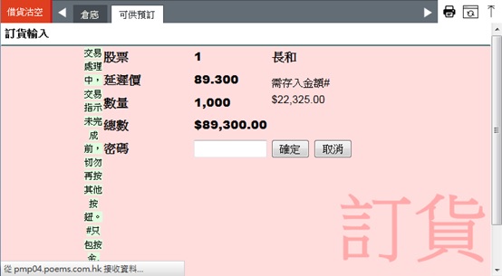 其後,左方會顯示需存入金額(貨值的25%)。輸入密碼並按「提交」。 閣下可於倉底察看訂貨的狀態