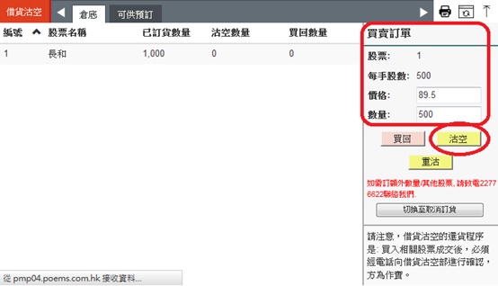 在左方倉底點選要沽空的股票,然後於右上方輸入沽空的價格(須是最佳沽盤價或以上)及數量,並按下「沽空」鍵。