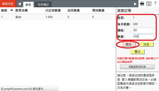 如沽空後要買回股票,要先在左方倉底點選已沽空的股票然後於右上方輸入買回的價格及數量,並按下「買回」鍵。