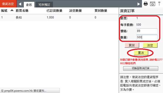 如閣下即日買回後要即日再沽空,則需要使用「重沽」功能。同樣地,先在左方倉底點選已沽空的股票然後於右上方輸入價格及數量,然後按下「重沽」鍵。