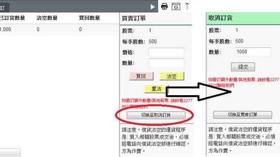 如果閣下於訂貨後不願沽空,可以取消訂貨。在左方倉底點選要取消訂貨的股票,然後於右下方按下「切換至取消訂貨」,輸入數量,並按下「提交」。