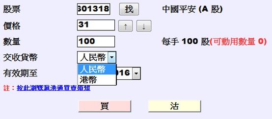 當進行滬股通交易時可選擇以港幣或人民幣為交收貨幣。如選擇以港幣收貨,本公司將會自動從閣下的戶口中把相應的港幣轉換為人民幣。滬股通中的買/賣盤有效期謹可選擇即日。