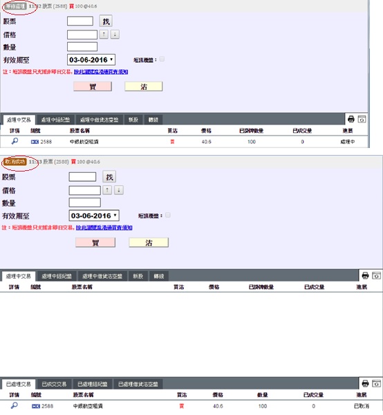 iii) 交易欄左上角即時顯示交易狀態,例如[等待處理]或[取消成功]。