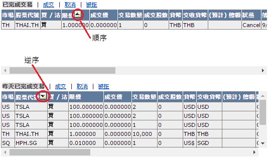 4.) 雙擊交易狀態內欄目名稱,可排序資料,方便尋找目標交易。