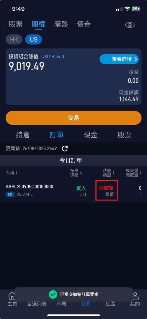 11. 撤單:點擊該筆訂單 → 右下角 撤銷 → 再次點擊 撤銷 確認。