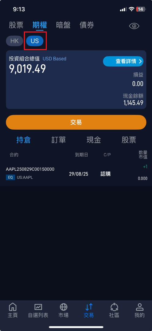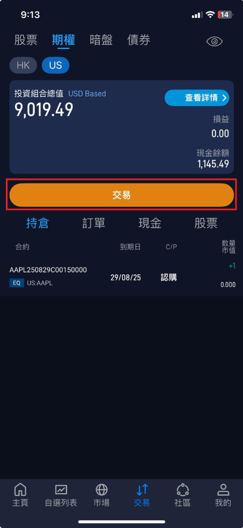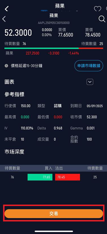 6. 進入相關股票後 → 點擊上方 期權,選擇到期日,於期權鏈選取合約(例:AAPL 150.00 2025-09-05 認購)。