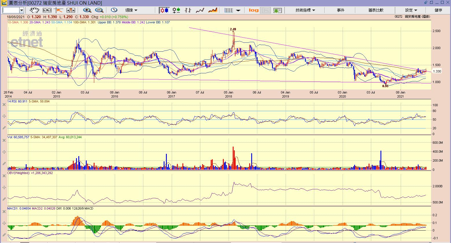 瑞安房地產有限公司現時股價為港幣1.33元,PB只有0.232倍!股價處於近6年地位。比過往的配售價更低;大股東亦密密增持股份,有閑錢的朋友可以跟大股東買入。盼望日後恢復派息或私有化的想象空間。(業績沒有想象空間,可以不理)