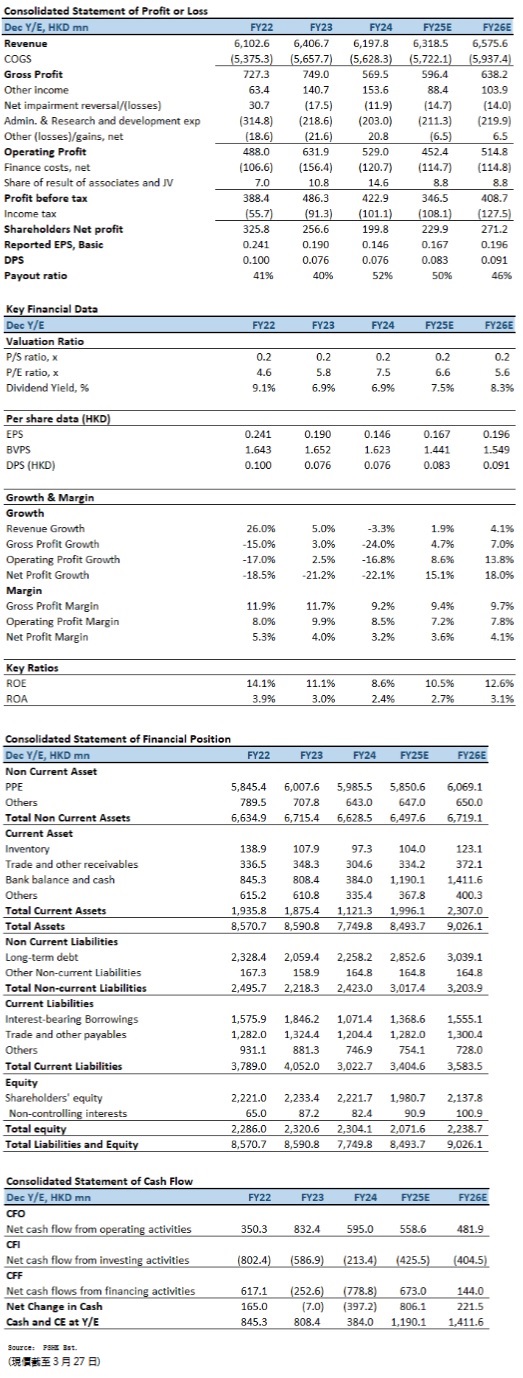 展望2025年,公司計畫實現總銷氣量27億立方米,同比增長9%。其中,管道天然氣銷售目標為19億立方米,同比增長9%,而管輸氣量預計保持穩定。城鎮燃氣毛差預計提升至0.52元。在資本管理方面,公司計畫進一步壓降融資成本2000萬人民幣,並維持資本開支5億元,以支持業務擴張。同時,公司計畫逐步提升派息水平,2025至2027年間每年提高每股派息額不少於10%,預計2027年每股派息額將達10仙。此外,公司計畫進一步優化氣源採購策略,減少供應鏈波動風險,並通過建立資源池實現上游直采及終端市場拓展。2025 年,公司將繼續深化與三桶油、北京燃氣、新天綠色能源等供應商的合作,並計畫通過優化採購結構降低綜合採購成本。儘管 2024 財年公司盈利能力受到短期市場因素影響,但在優化採購策略、債務結構調整及終端市場拓展的推動下,濱海投資的盈利能力及現金流狀況有望在 2025 年回暖。此外,公司逐步提升派息水平,將增強股東回報率。因此,我們預期公司2025至2026年EPS預測為0.167及0.196元,目標價為1.05元,對應2025的預測市盈率為6.3倍(與過去五年平均市盈率相若),評級為“中性”。