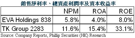 其中億和控股(838.HK)為同業中業務最相近的一家公司。比較東江與億和這兩家公司2015年的銷售淨利率、總資產利潤率及資本收益率如下表所示: