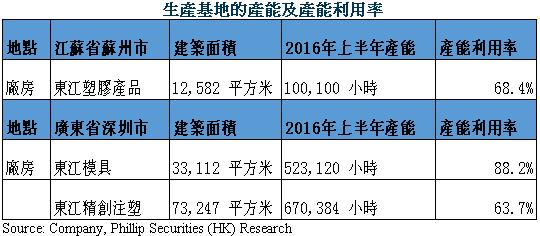 公司經營兩項業務:模具製作業務和注塑組件製造業務。2016年上半年,公司模具製作業務部收入290.2百萬港元,按年增長18.8%,占集團總收入40.2%(外界客戶收入),該分部的毛利率為26.2%。而注塑組件製造業務收入431.1百萬港元,按年下跌11.9%,占集團總收入的59.8%;得益於公司自動化的投入及產品結構的調整,該分部的毛利率由2015年同期的23.4%提高至26.6%。
