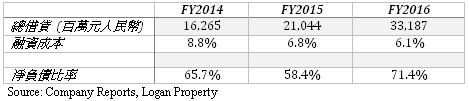 融資成本下降儘管貸款總額增加: 儘管龍光地產總借貸由2015年的210.44億元人民幣增加至2016年的331.87億元人民幣,增幅達57.7%。 淨負債比率從2015年的58.4%大幅上升至2016年的71.4%,然而,平均融資成本由2015年的6.8%下降至2016年的6.1%。